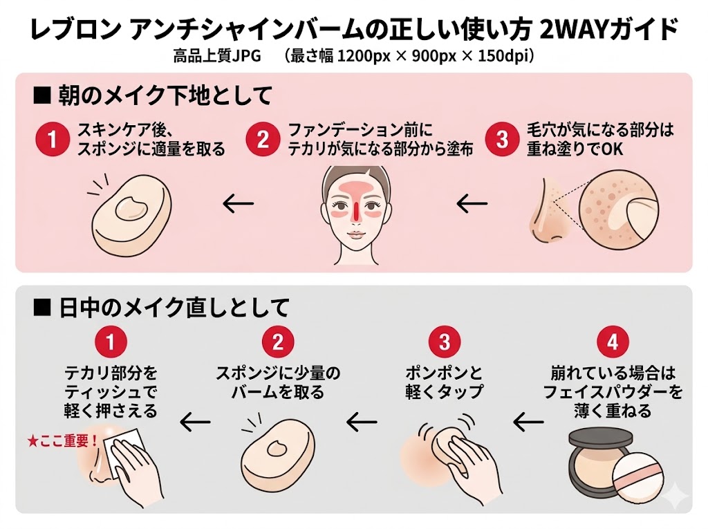 まず朝のベースメイク時にスポンジで顔全体またはTゾーン・小鼻などのテカリが気になる部分に塗布します。シリカ(皮脂吸着成分)がじわじわ分泌される皮脂をキャッチし、時間が経ってもさらっとした肌をキープ。さらにソフトフォーカス効果で毛穴や小じわをふんわりぼかし、写真映えする「フォトレディ」な仕上がりへ導いてくれます。