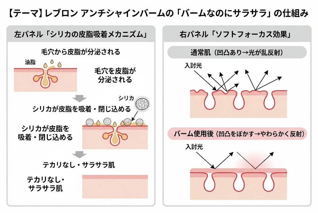 テカリ防止の肝は、配合されている**シリカ(皮脂吸着成分)**にあります。シリカは微細な多孔質の粉体で、スポンジのように皮脂を吸着して閉じ込めることでテカリを抑えます。