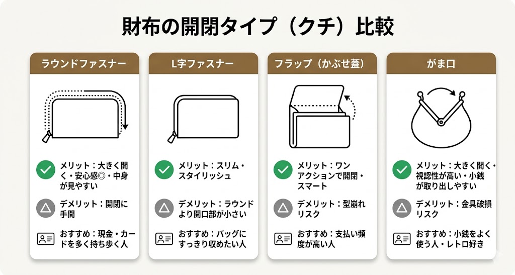 財布の「形」だけでなく、「クチ(開閉部分)」の違いも見逃せないポイントです。同じ二つ折り財布でも、クチの違いで使い勝手はまるで別物になります。