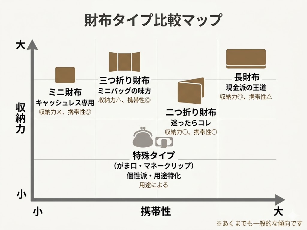| キャッシュレス中心・ミニバッグ派 | 三つ折りまたはミニ財布 |