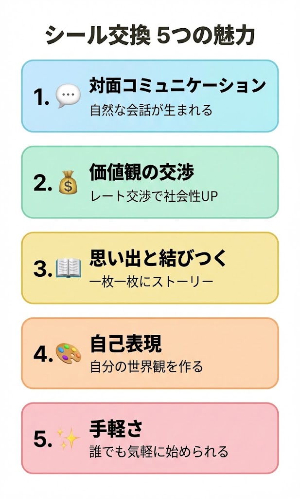 あなたも、かわいいシールを一枚手に取って、誰かと「交換しませんか?」と声をかけてみてはいかがでしょうか。そこから生まれるコミュニケーションと思い出は、きっとデジタルでは味わえない特別なものになるはずですよ。