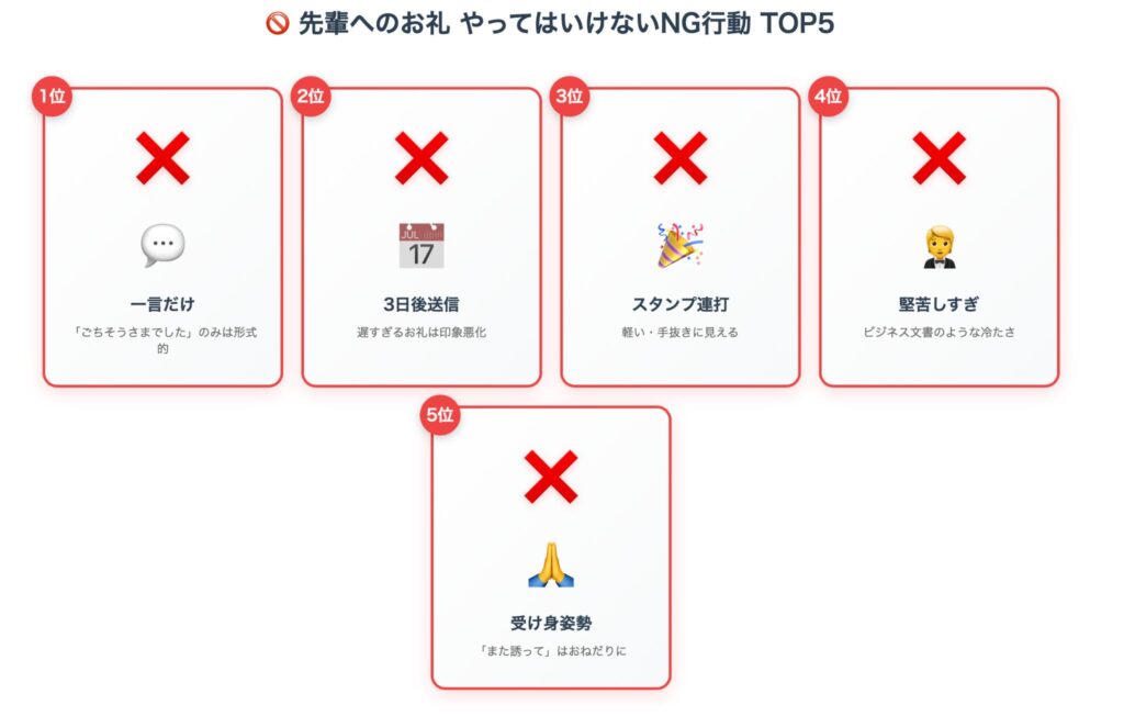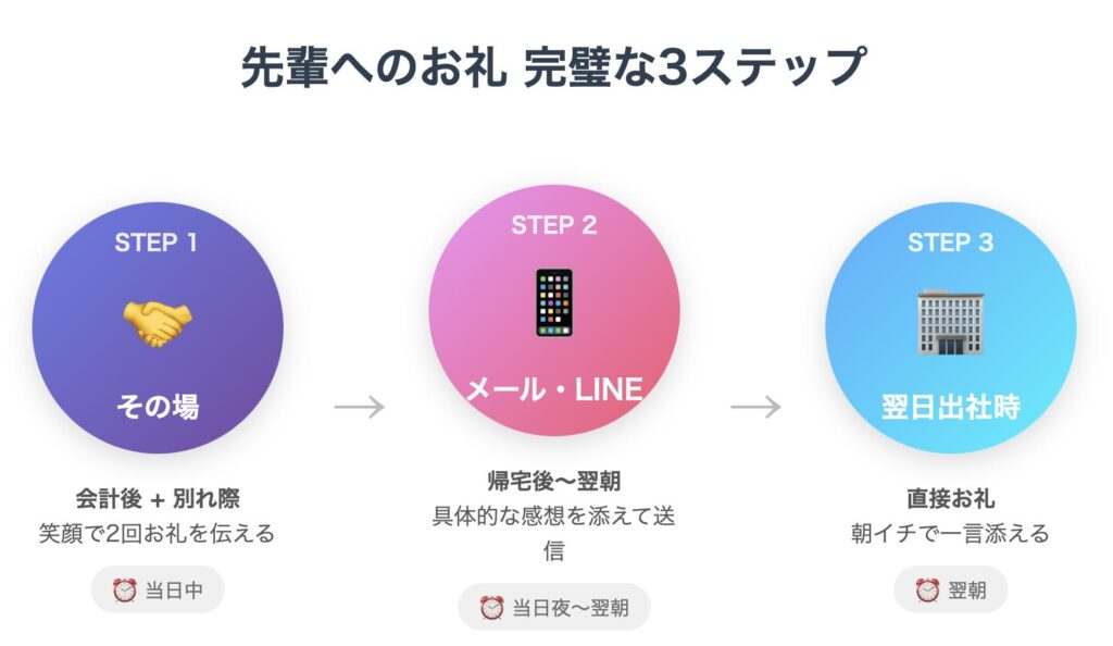 この「三段階のお礼」(その場 → メール・LINE → 翌日直接)をマスターすれば、どんな先輩からも好印象を持ってもらえるはずです。