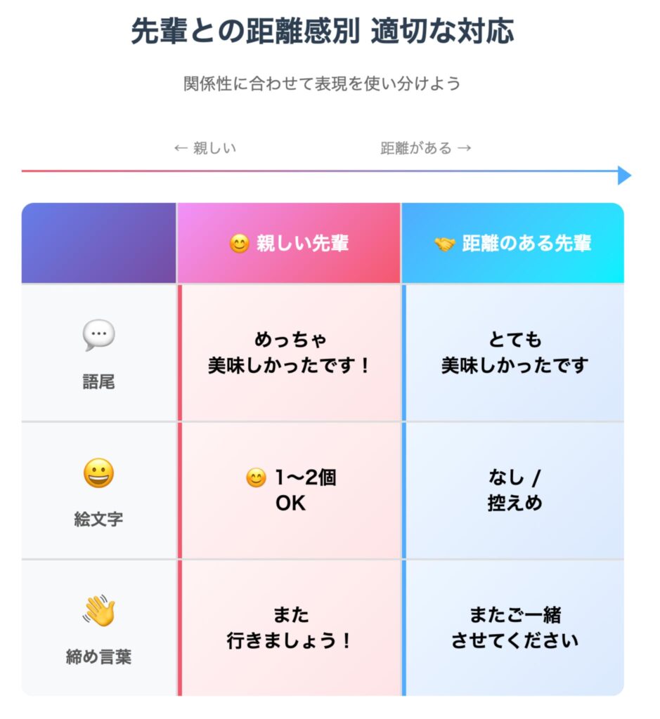 | 適した相手 | 距離のある先輩、役職者 | 普段から連絡を取り合う先輩 |