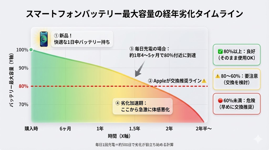 充電サイクルについては、一般的にリチウムイオン電池は約500回の充電で初期容量の70〜80%程度まで劣化するといわれています。毎日1回充電していると、単純計算で1年4〜5ヶ月ほどで劣化が目立ってくる計算です。