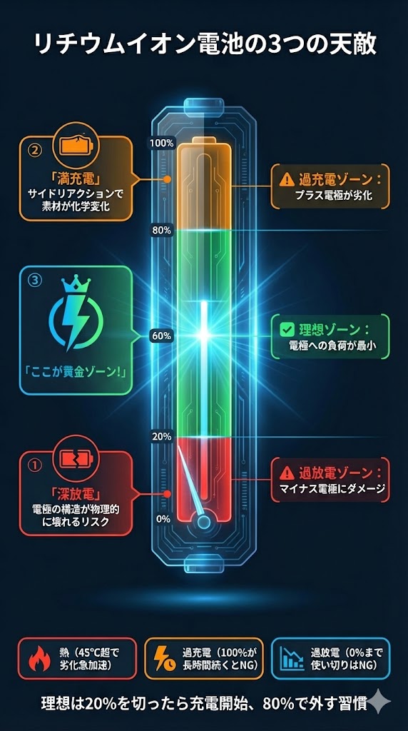逆側も問題です。残量が0%に近づくと「深放電」という状態になり、バッテリー内部の電圧が急激に下がってマイナス電極にダメージが及びます。これが繰り返されると、電極の構造が物理的に壊れていく可能性があります。