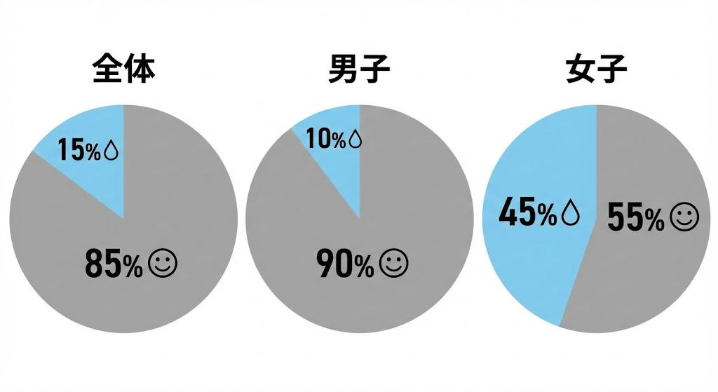 男女別で見ると、男子は約10%、女子は約45%という割合になっています。女子の方が圧倒的に多いわけですが、それでも半数以上は泣いていないんです。