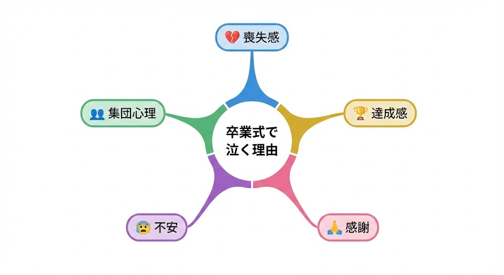 心理学的には、喪失感、達成感、感謝、不安、集団心理という5つの要素が涙を誘発します。これらは年代によっても異なり、小学校から大学まで、それぞれ違った意味を持つんですよ。