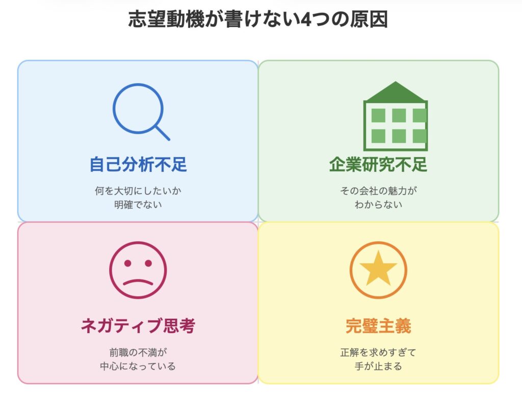 志望動機が書けないとき、多くの場合は以下の4つのパターンに当てはまります。まずは自分がどのタイプなのかチェックしてみましょう。