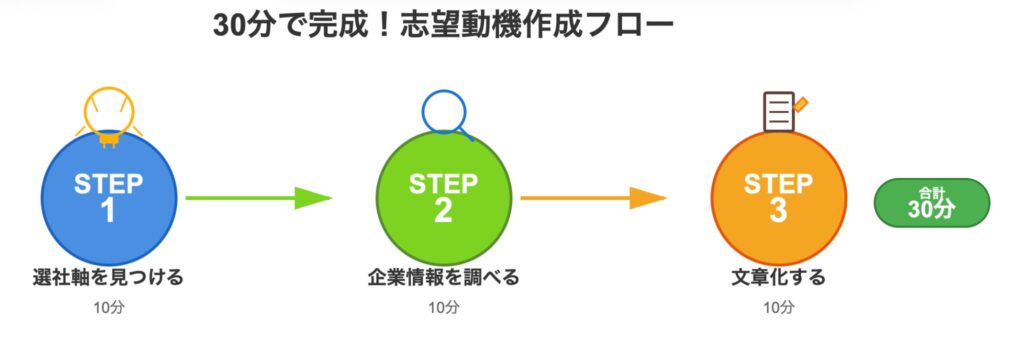 それでは、具体的に志望動機を作っていきましょう。このステップに沿って進めれば、30分程度で志望動機の骨格が完成します。