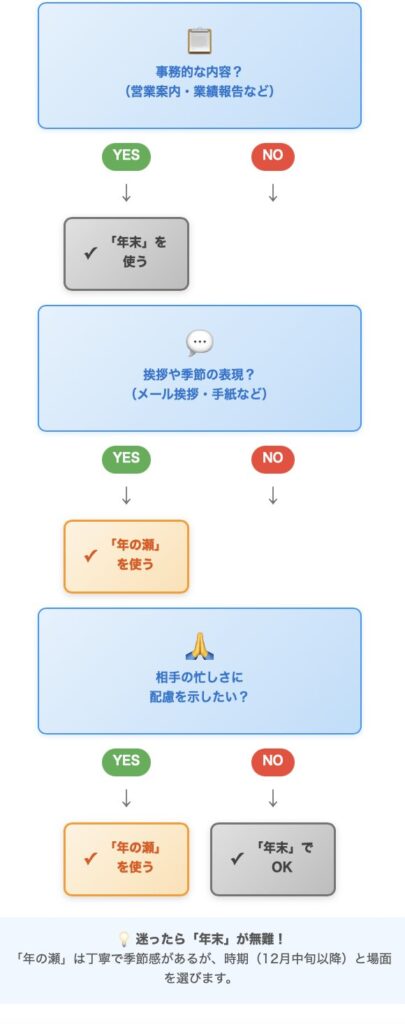• 第一選択:「年の瀬」(丁寧で好印象)