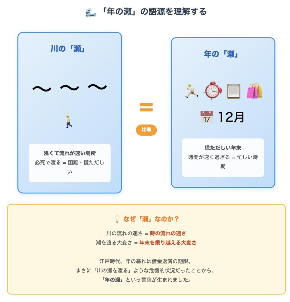 この「瀬を渡る=困難で慌ただしい状況を乗り越える」というイメージが、年末の忙しさと重なったわけです。