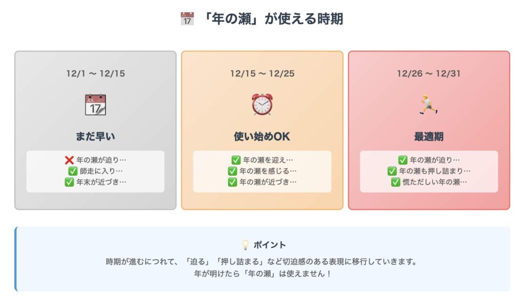 辞書的には「年末全般」を指す言葉ですが、実際の使用感覚としては12月に入ってすぐに「年の瀬」と言うのは少し早い印象を与えます。
