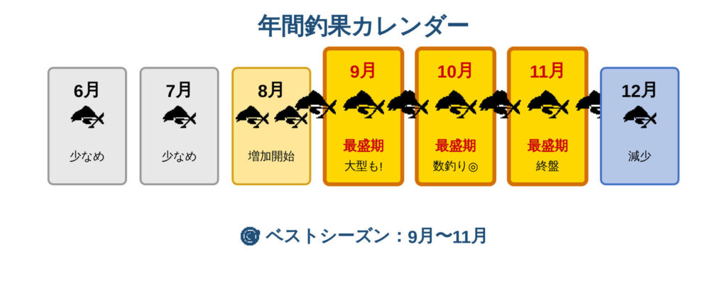 最も釣りやすい時期(ベストシーズン)ルアー釣りとエサ釣りの両方で好釣果大型も期待できる