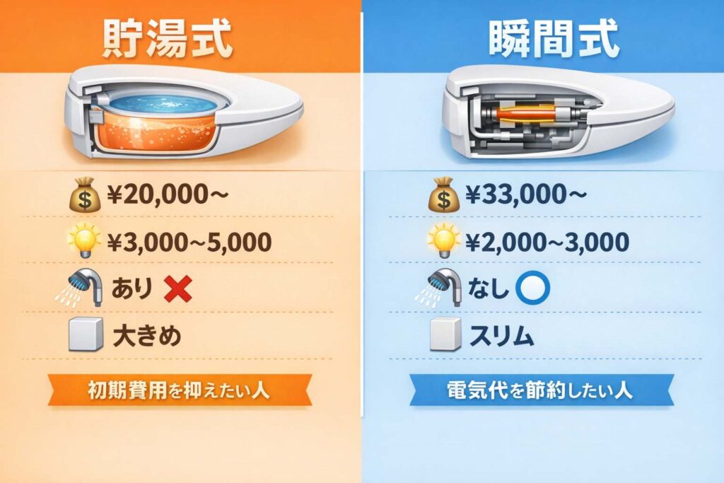 温水洗浄便座の価格は、貯湯式か瞬間式か、どんな機能が付いているかによって大きく変わります。