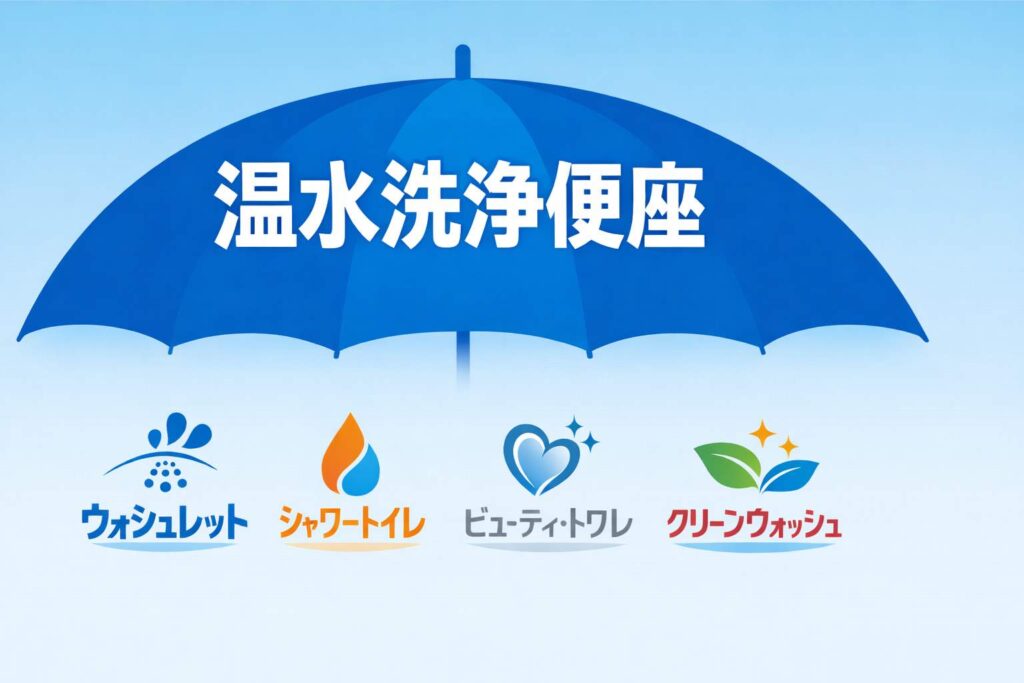 「温水洗浄便座」という一般名称があるにもかかわらず、各メーカーは独自の商品名で販売しています。ここでは主要メーカーの呼び方と特徴を見ていきましょう。